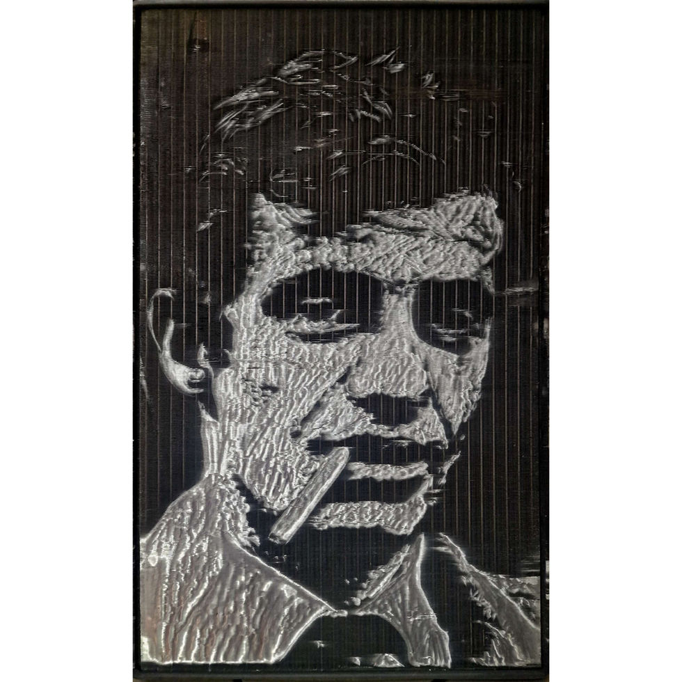 Cette sculpture unique représente Jean-Paul Belmondo, l'icône du cinéma français, finement réalisée à la main sur un radiateur de voiture à l’aide d’une petite cuillère. Chaque détail de son visage, capturant son charisme et son énergie, est soigneusement sculpté. Une œuvre originale, idéale pour les fans de cinéma et les collectionneurs d'art.